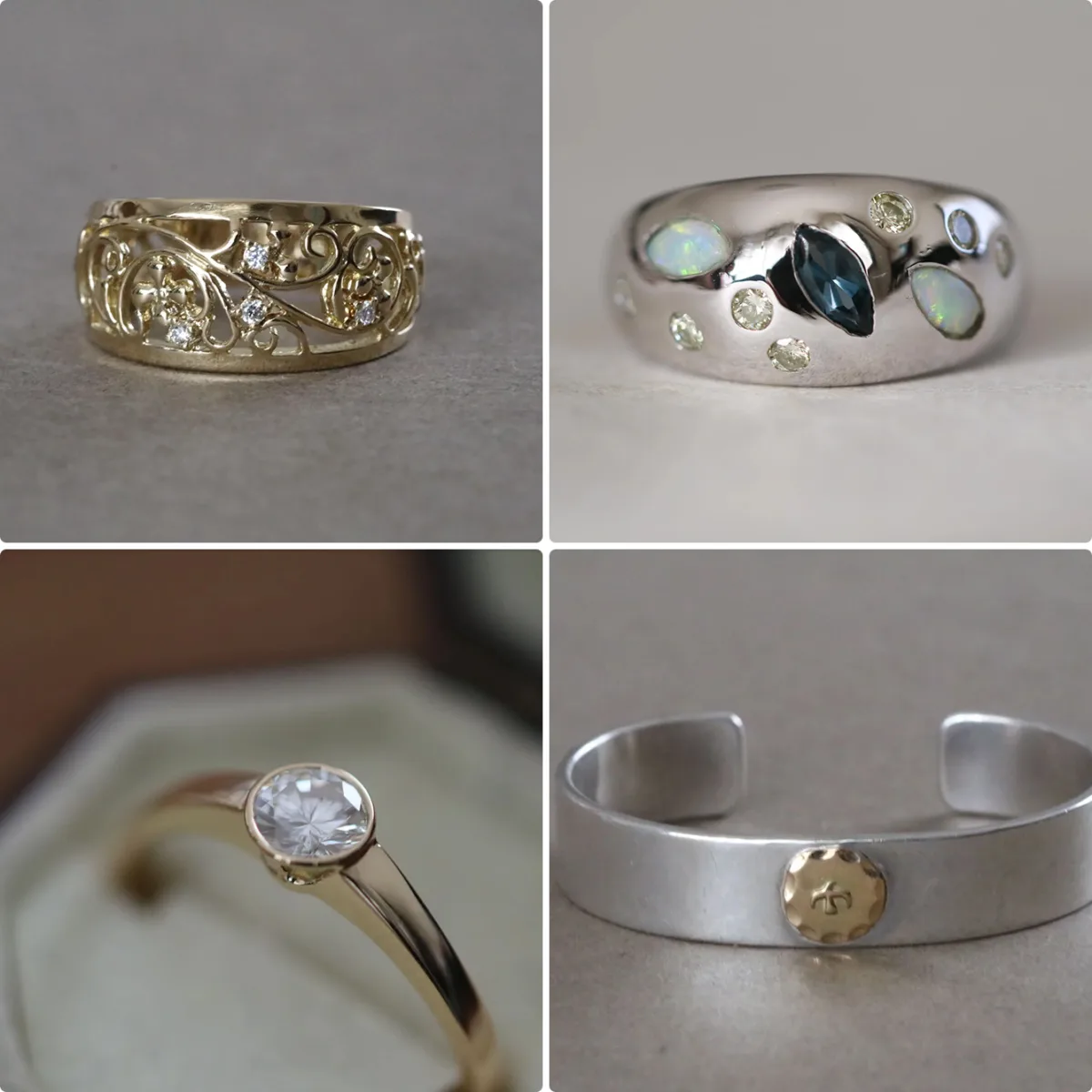 日常に自然と溶け込み、手に取るたびに気持ちが高まるようなジュエリーを制作するため、石の選定から石座づくり、リングのデザインに至るまで、ほとんどの工程を作家自身が手がけています。一点一点に丁寧な手仕事が息づき、使い捨てられるものではなく、持ち主の暮らしに寄り添いながら永く愛される存在を目指したジュエリーです。