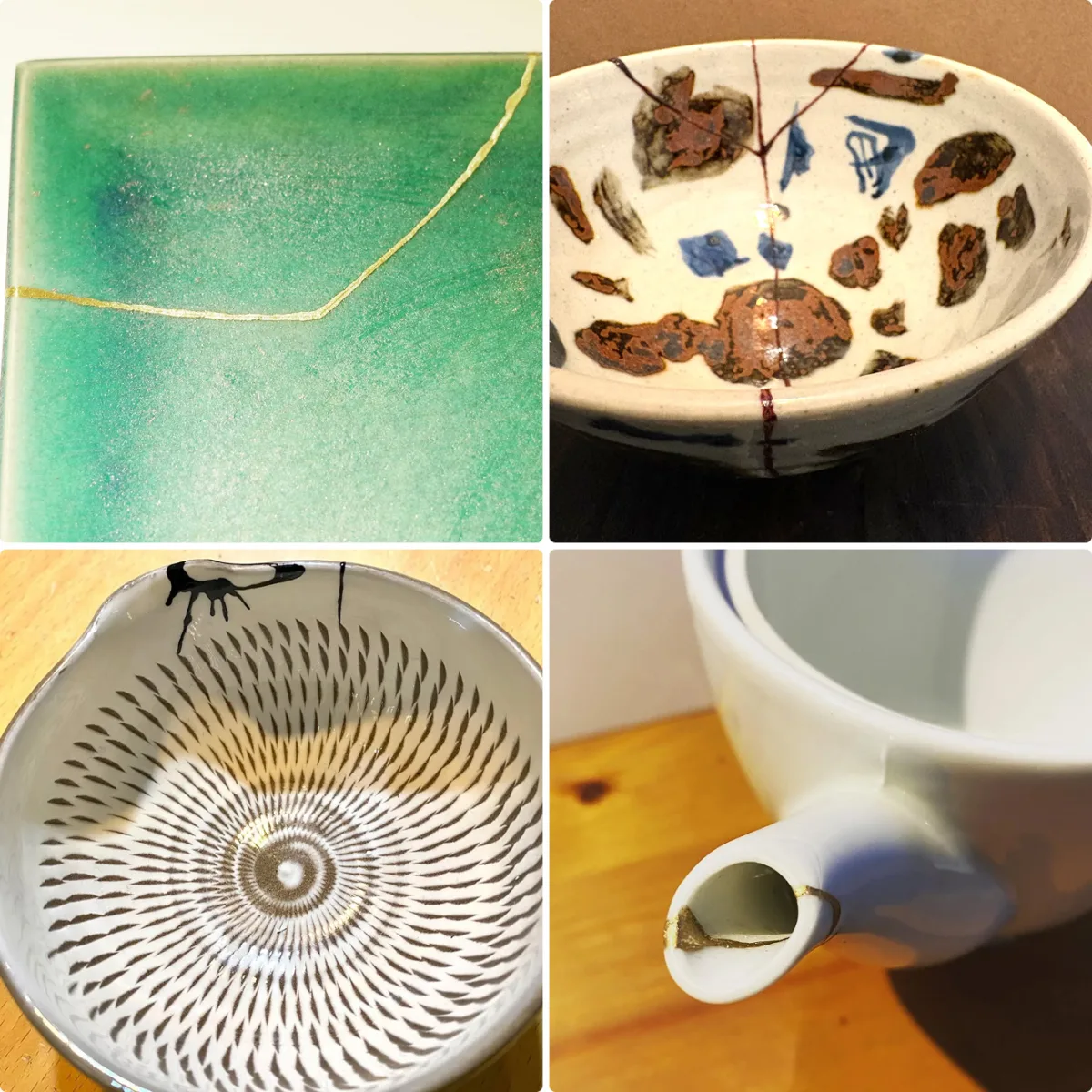陶磁器や漆器はもちろん、ガラスや花瓶など幅広い修理に対応。金や銀に加え、赤・黄・緑など色漆を使った仕上げも可能で、器の魅力を引き出す修復を行っています。壊れた器を再び暮らしに取り入れることで、「ものを大切に使い続ける価値」を伝えています。